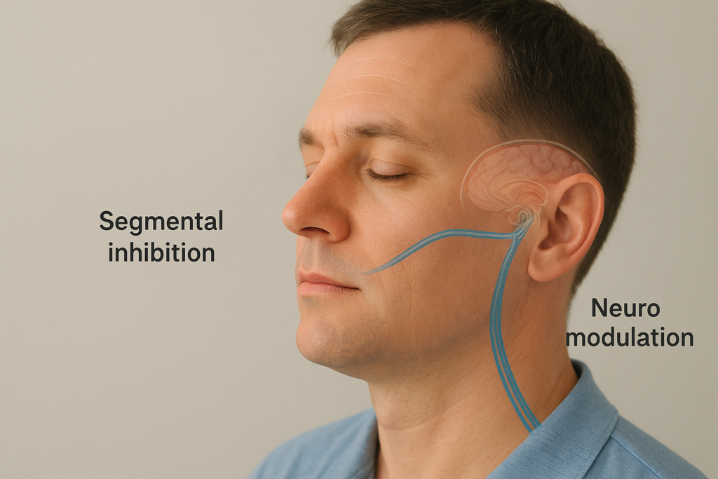 עיכוב עצבי מקומי (segmental neural inhibition) — פעולה ישירה על אזורים ממוקדים של העצב.